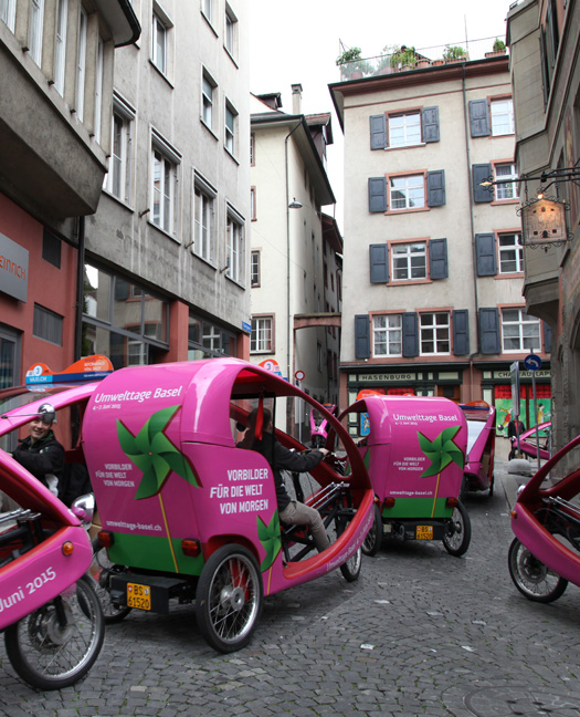 Seit 2010 fahren sie auch in Basel: Die Velotaxis. Werbeflächen an den Velotaxis geniessen grosse Aufmerksamkeit.