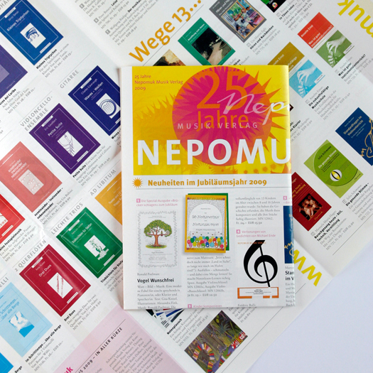 Anspruchsvolle Aufgaben lösen: Mit der Gestaltung zahlreicher Musiktitel für den Musikverlag Nepomuk sind wir gewachsen. Im Bild die Jubiläumszeitung mit dem Emblem und den Musiktiteln. Weitere Beispiele Logos unter Illustration, ganz nach unten gescrollt.