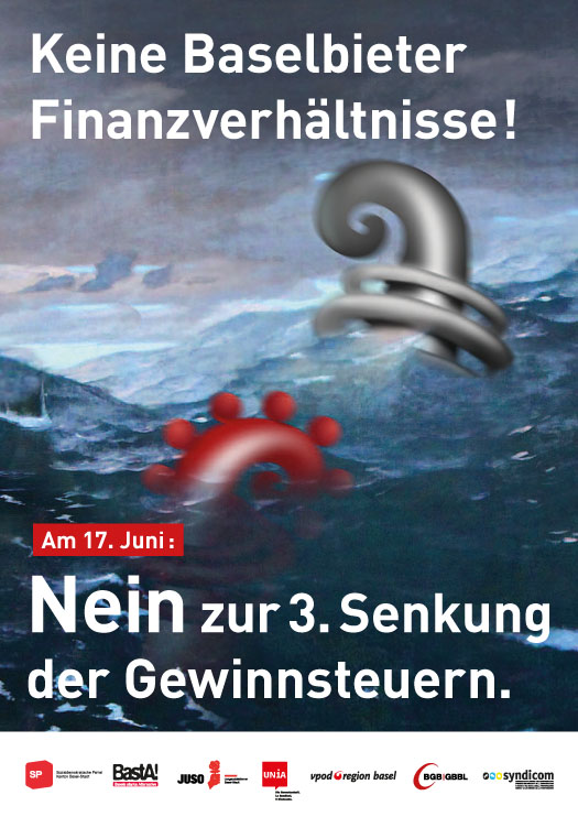 .Mit klaren Kernaussagen punkten. Beispiel Abstimmungsplakat: Nein zur 3. Senkung der Gewinnsteuern. Idee und Umgesetzug unter Zunahme eines Bildausschnitts 'Im Spiel der Wellen' von Arnold Böcklin.